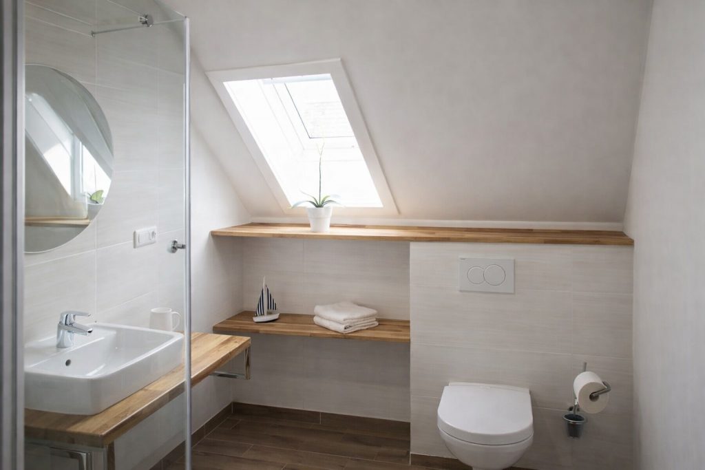 Vom Flur aus gelangt man ins Schlafzimmer mit großem Kleiderschrank und Boxspringbett oder ins Badezimmer. Es ist mit einer Dusche, sowie ein WC inkl. Waschbecken, ausgestattet.