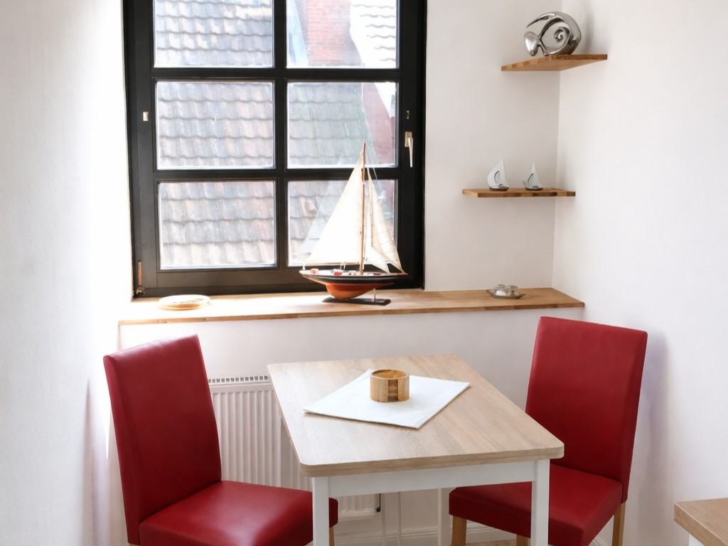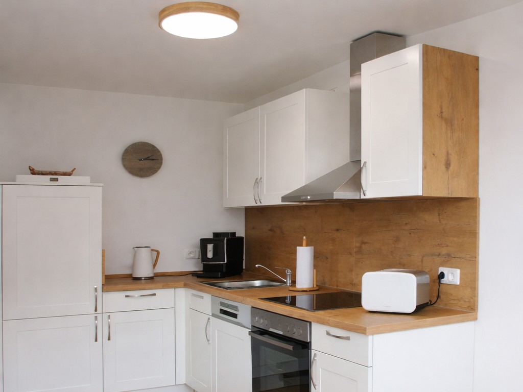 Von hier aus gelangt man in die Küche. Neben Herd, Backofen, Mikrowelle und Kühlschrank verfügt die Küchenzeile über eine Kaffeevollautomaten. In der Küche finden bis zu drei Personen am kleinen Esstisch Platz.