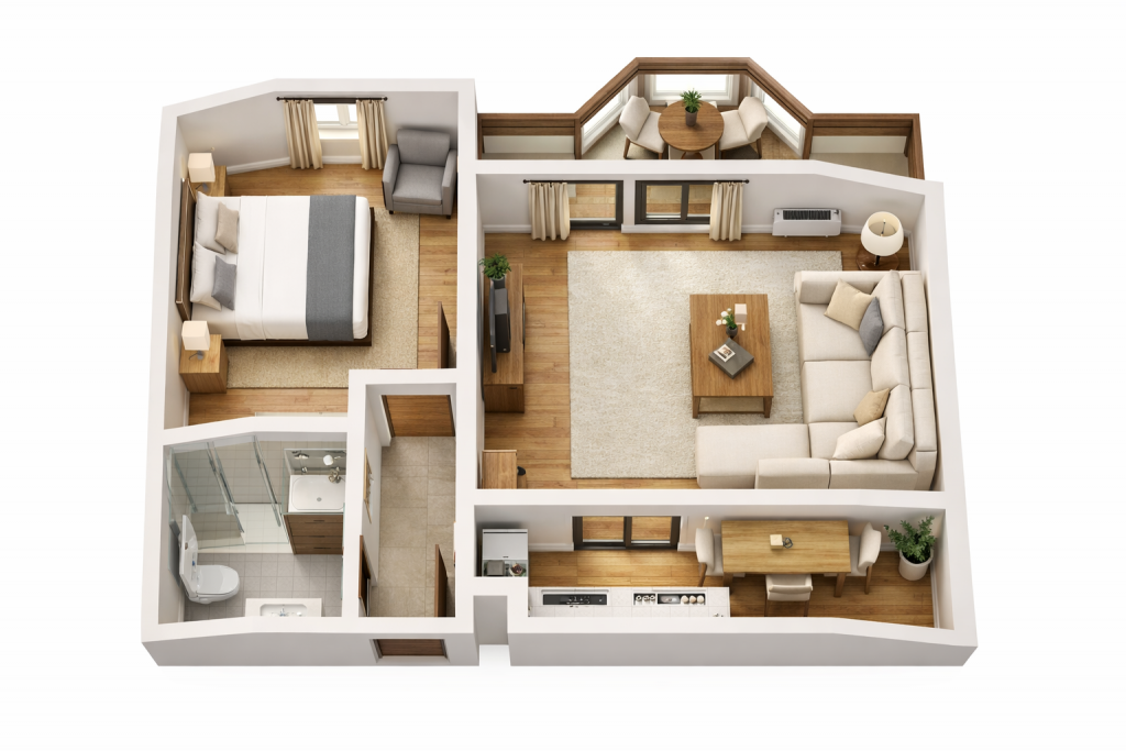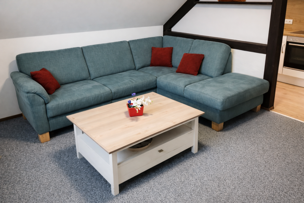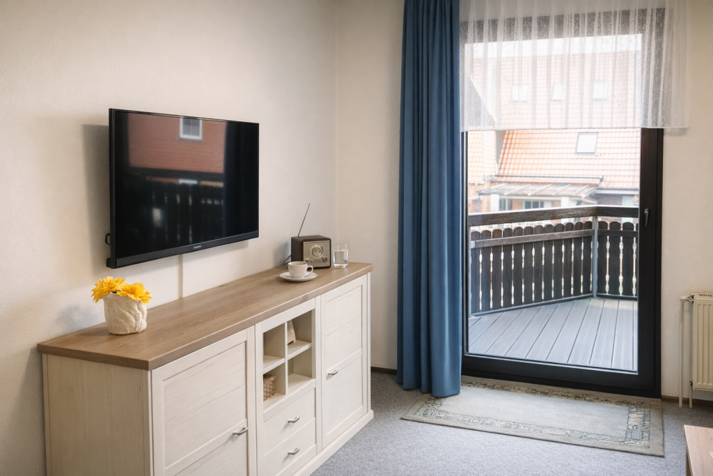 Wohnung 3 bietet 48m² Wohnfläche und besitzt einen Balkon mit perfekter Südausrichtung. Dieser ist vom Wohnzimmer aus zu erreichen. Das Wohnzimmer selber ist mit einem Sofa, einem Sessel und einem Fernseher ausgestattet.